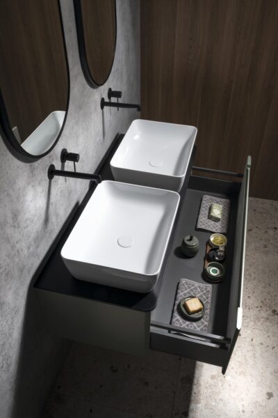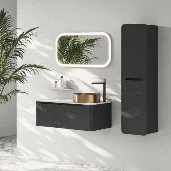 Lakovaná série nábytku KERALA pro umyvadla na postavení v moderních matných barvách se vyznačuje výrazným designovým prvkem – zaoblenými boky a čelem zásuvky. Skříňky jsou jednozásuvkové, bezúchytkové a s plynulým dovíráním. V nabídce jsou 2 typy desek o tl.12 mm: bílá matná Rockstone a černá matná kompaktní deska PREMIO z vysokotlakého laminátu. Umyvadlo na desku lze libovolně umístit po celé šířce skříňky. Umyvadlové skříňky nabízíme v šířkách 80, 100, 120 a 140 cm a lze je doplnit o vysokou dvířkovou skříňku ve stejném oblém designu.