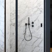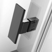 • Sprchové dveře do niky 120×200 cm. Otevíravé dovnitř a ven. Čiré bezpečnostní sklo s povrchovou úpravou proti usazování vodního kamene. Barva profilu černá. Dveře nebyli nikdy instalovány. Množství 1 ks.