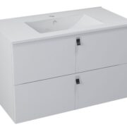 • Koupelnová skříňka s keramickým umyvadlem závěsná. Rozměr umyvadla 100×46 cm. Rozměr skříňky 89,5x55x45,2 cm. Madla v provedení chrom. Materiál MDF/lamino. Bílá lakovaná.